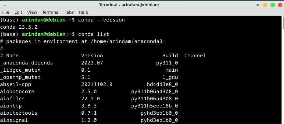 conda --version아래에서 볼 수 있듯이, 내 테스트 시스템에서는 Anaconda 설치가 성공했습니다.